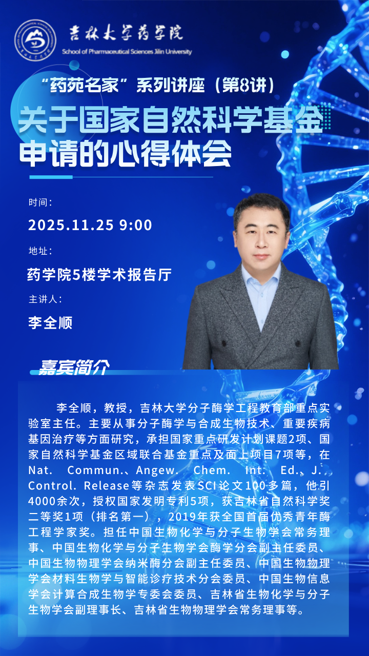 为助力学院教师提升国家自然科学基金申请质量,夯实项目申报基础,11月25日,学院举办“药苑名家”系列讲座(第8讲),特邀李全顺教授担任主讲。讲座由副院长曹霞主持,院长项金宝及师生代表共同参加。李全顺教授在国家自然科学基金申报方面经验丰富,曾多次主持国家级科研项目,对基金政策、选题策略、撰写规范及评审要点具有深刻见解。讲座中,他结合自身申报与评审经历,从前期准备、选题定位、申请书撰写到风险规避等关键环...