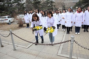 每个学院选两名学生代表上前献花,并集体低头默哀一分钟。面对着白求恩先生,这位无私奉献的英雄,同学们怎么能不肃然起敬?正是因为有了他们这些革命先烈,有了他们的崇高,有了他们的无私才有了今天的和平环境,才有了祖国的繁荣昌盛,他们应于日月同辉,与江河共存!