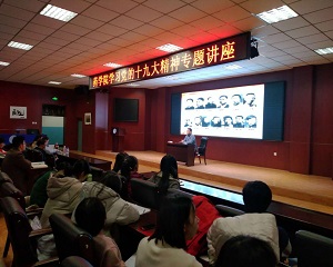 韦教授以“以社会主要矛盾变化为抓手,学习把握十九大报告”为题,以1921年7月全国一大为开端,细致地向同学们讲述党的发展历程,突出表现90多年间,中国共产党经历了沧海桑田的变化。从50多人的小团体到如今近9000万人的庞大规模,中国共产党的脚步正不断迈进。韦教授重点提及:如今我国社会主要矛盾已经发生转化,即人们日益增长的美好生活需要和不平衡不充分的发展之间的矛盾,这正是中国特色社会主义进入新时代的标志。大会中提到两个重要的时期,一是从现在到2020年,这几年将成为全面建成小康社会的决胜期;二是从十九大到二十大,这五年是“两个一百年”奋斗目标的历史交汇期”。
