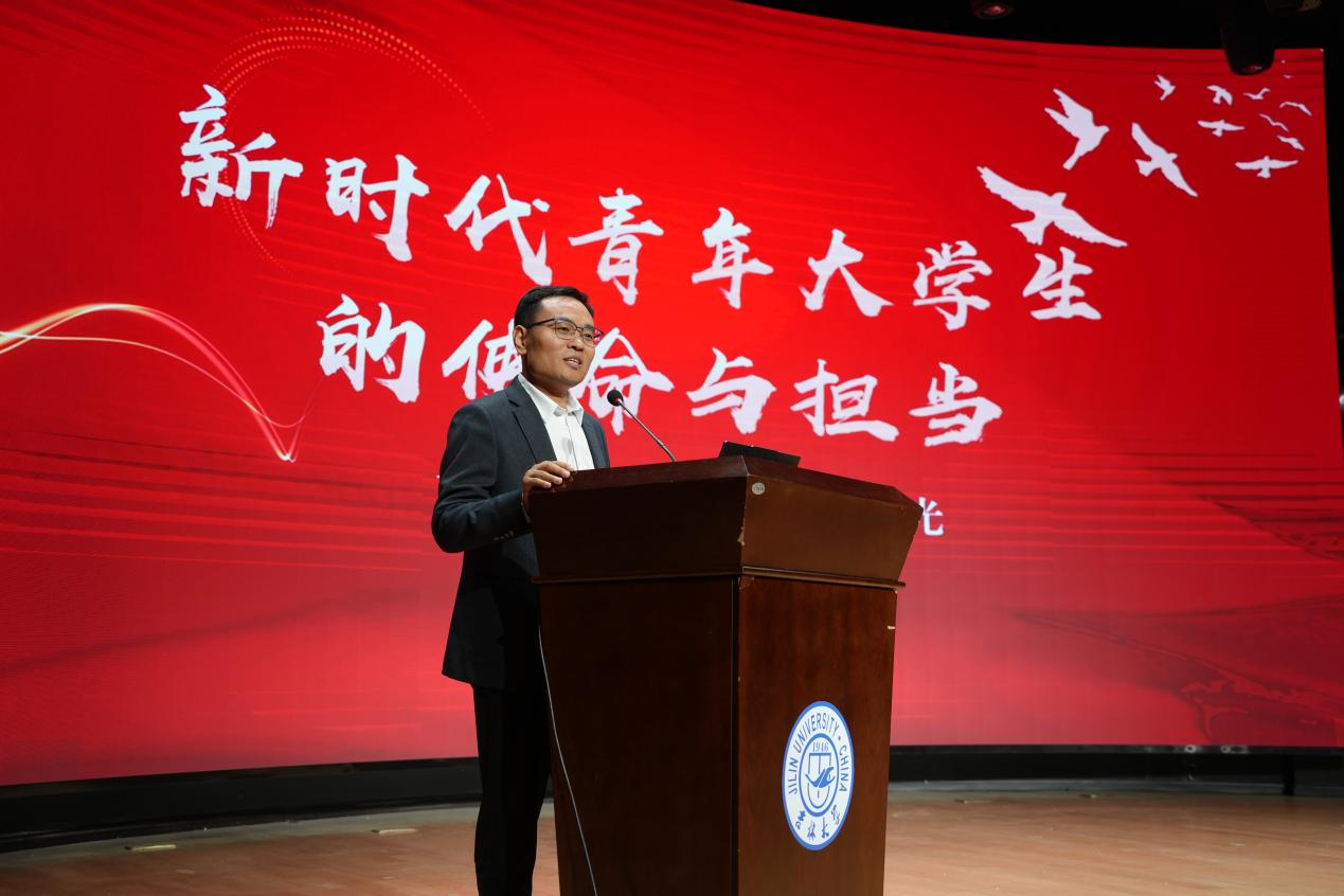 与我们”的核心命题,系统梳理学校的发展脉络与精神谱系:从战争年代淬炼的红色革命精神,到白求恩大夫“毫不利己、专门利人”的白求恩精神;从支援国家建设时期勇担使命的北上精神,到新时代黄大年教授“心有大我、至诚报国”的黄大年精神。这一脉相承的精神谱系,既是学校近80年办学历程的灵魂所在,更是激励一代又一代吉大学子成长的精神源泉。他结合学校“建设中国特色、世界一流大学”的发展目标,以及学院在创新药物研发、临床药学服务等领域助力健康中国战略的实践成果,让新生真切感受到“大学”二字背后的家国责任与时代分量。