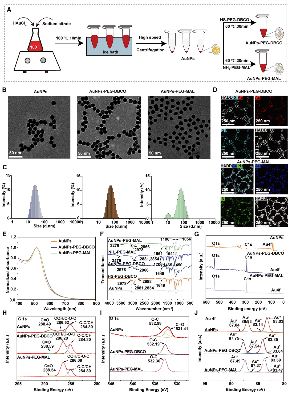 图2. 金纳米颗粒和功能化金纳米颗粒的物理化学表征