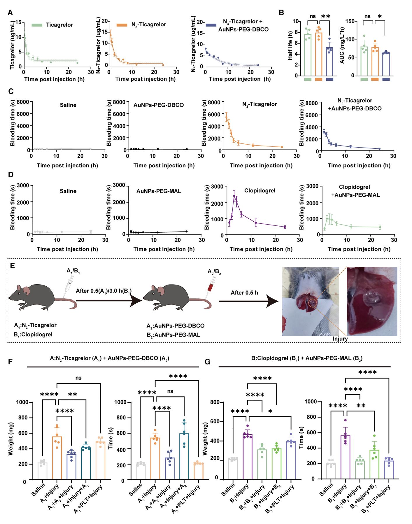(a) HS-PEG-DBCO和NH2-PEG-MAL分别与N3替格瑞洛和氯吡格雷的活性代谢产物发生化学反应;(b)N3替格瑞洛、氯吡格雷AM、HS-PEG-DBCO和N3替格瑞洛的结合物、NH2-PEG-MAL和氯吡格雷AM的结合物的基质辅助激光解吸电离飞行时间质谱(MALDI-TOF-MS);(c)SPR法测定HS-PEG-DBCO与N3替格瑞洛的结合亲和力;(d)NH2-PEG-MAL和氯吡格雷AM的结合亲和力;(e)血小板聚集率试验示意图。(f)氯吡格雷和N3替格瑞洛在血小板聚集试验中的抗血小板活性(n=3)。(g)在血小板聚集试验中,AuNPs-PEG-DBCO对N3-Ticagrelor的体外功能逆转(n=3)。(h)在血小板聚集试验中,AuNPs-PEG-MAL对氯吡格雷AM的体外功能逆转(n=3)。(i)AuNPs-PEG-MAL在血小板聚集试验中逆转氯吡格雷的体外功能(n=3)。*P<0.05;**P<0.01;***P<0.001;****P<0.0001