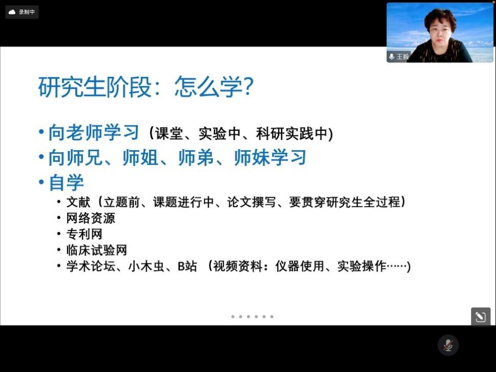 王院长指出,研究生阶段既要学习理论知识、实验技能,又要掌握分析问题解决问题的能力,并且通过举例说明研究生培养自身能力的必要性。同时,在课堂、实验中、科研实践中要向老师学习;其次要向师兄师姐进行学习,不要怕丢面子,要不耻下问;并且还要积极进行自学,在立题前、课题进行中、论文撰写乃至研究生整个学习生涯中都要认真阅读相关文献,从中学习新知识,了解新技能。此外还可通过专利网、临床试验网、学术论坛、小木虫、B站等多种媒介积极自学,掌握更多技能,提高自身水平。当遇到实验不顺利时,王院长表示要主动积极解决问题并和朋友、导师、辅导员等进行沟通,及时排解心理问题,这样才能更好地投入到科研学习工作中去。