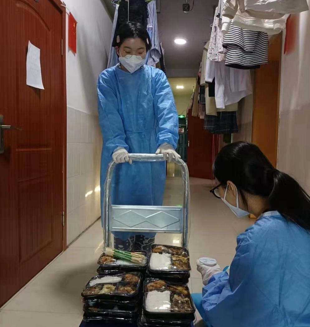 后来,我注意到我们的驻楼老师王梓俞老师每天都会出现在一楼,为我们安排一日三餐和各种物资。我们志愿者还是有休息时间的,而王老师每天都要做同样的工作,还要解决同学们生活上心理上遇到的各种问题,我们的物资在疫情期间不可能每天都在固定的时间送过来,可想而知王老师要时刻注意手机里的消息,这是一定会影响她休息的。此时,我又觉得自己所做的事情实在是微不足道的。