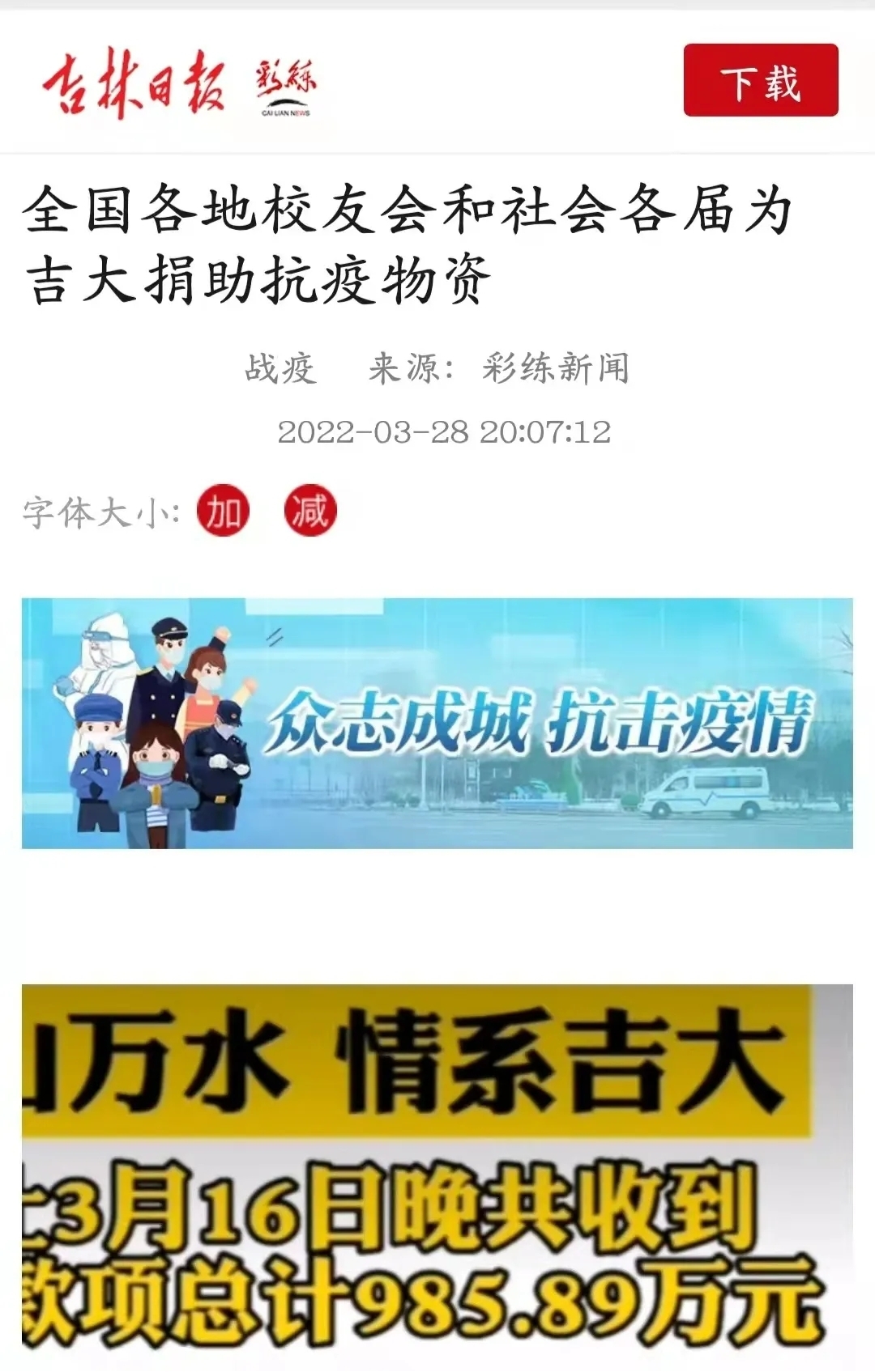 校友会及长春市红十字会进行捐款。捐款发起后,看到朋友圈里已经毕业的师兄师姐纷纷贡献自己的一份绵薄之力,看到微博中身处各行各业的校友们尽其所能帮助母校度过难关,深有感触,这就是吉大人的吉大精神吧。