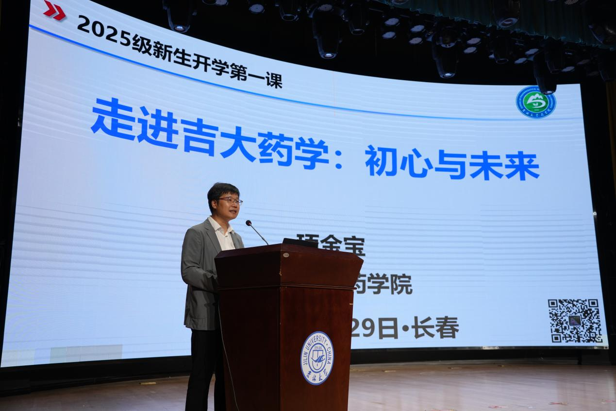 与我们”的核心命题,系统梳理学校的发展脉络与精神谱系:从战争年代淬炼的红色革命精神,到白求恩大夫“毫不利己、专门利人”的白求恩精神;从支援国家建设时期勇担使命的北上精神,到新时代黄大年教授“心有大我、至诚报国”的黄大年精神。这一脉相承的精神谱系,既是学校近80年办学历程的灵魂所在,更是激励一代又一代吉大学子成长的精神源泉。他结合学校“建设中国特色、世界一流大学”的发展目标,以及学院在创新药物研发、临床药学服务等领域助力健康中国战略的实践成果,让新生真切感受到“大学”二字背后的家国责任与时代分量。