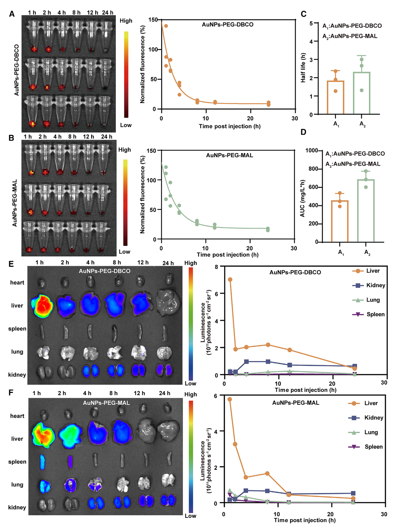 图4. AuNPs-PEG-DBCO和AuNPs-PEG-MAL的药代动力学和生物分布